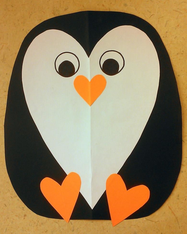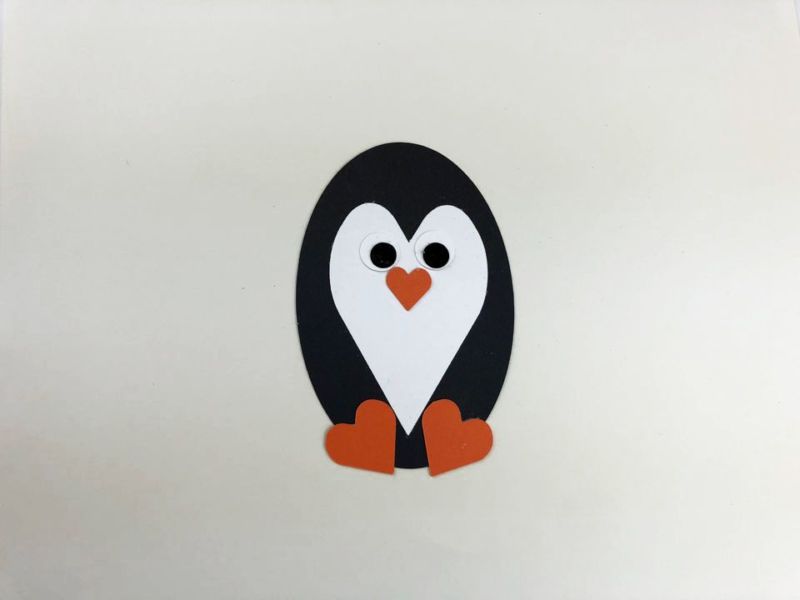 - Вземете черен овал и залепете към него бяло сърце с лепило PVA. На него залепяме очи и човка.