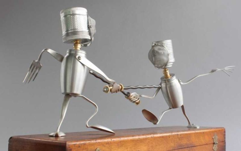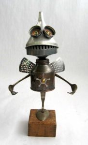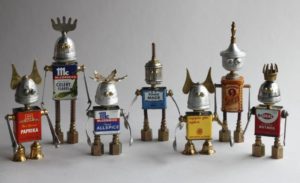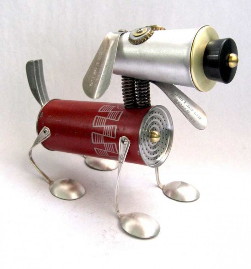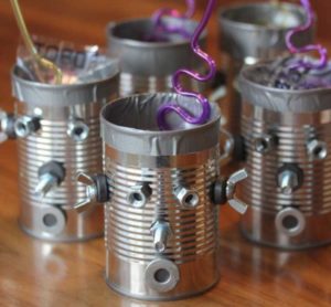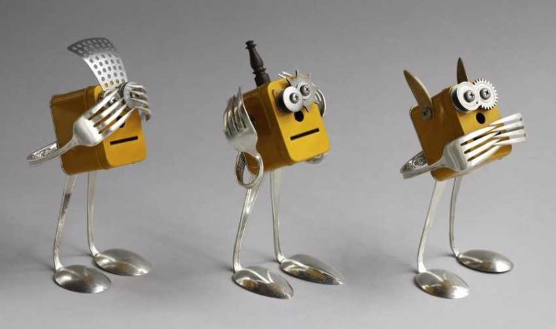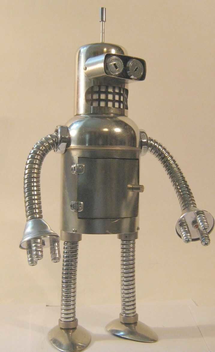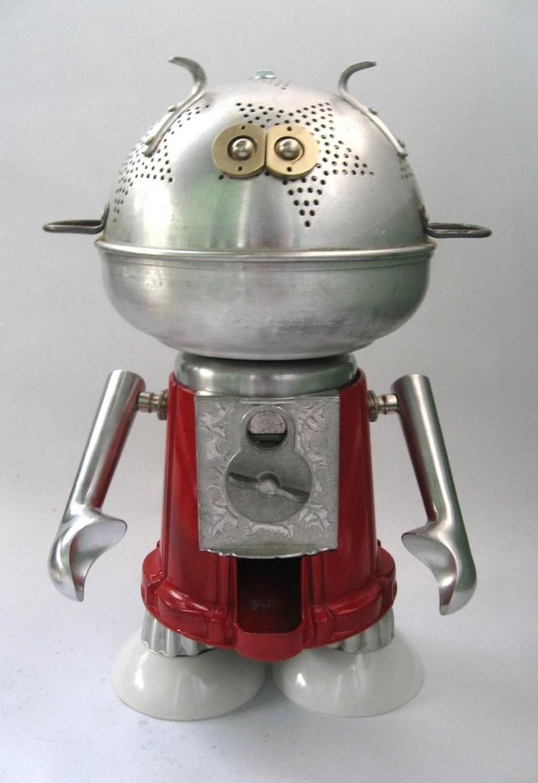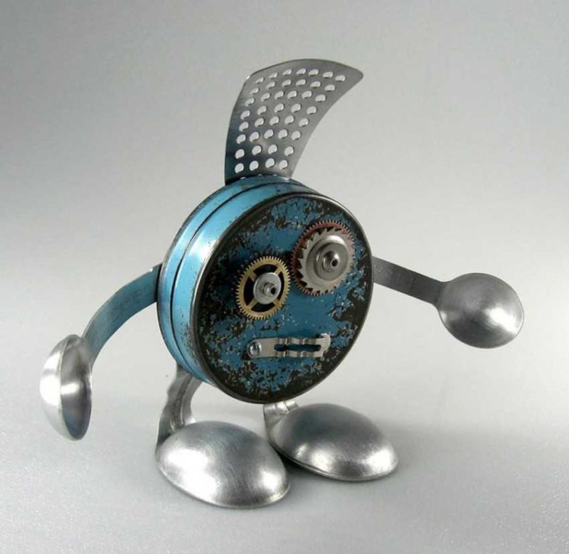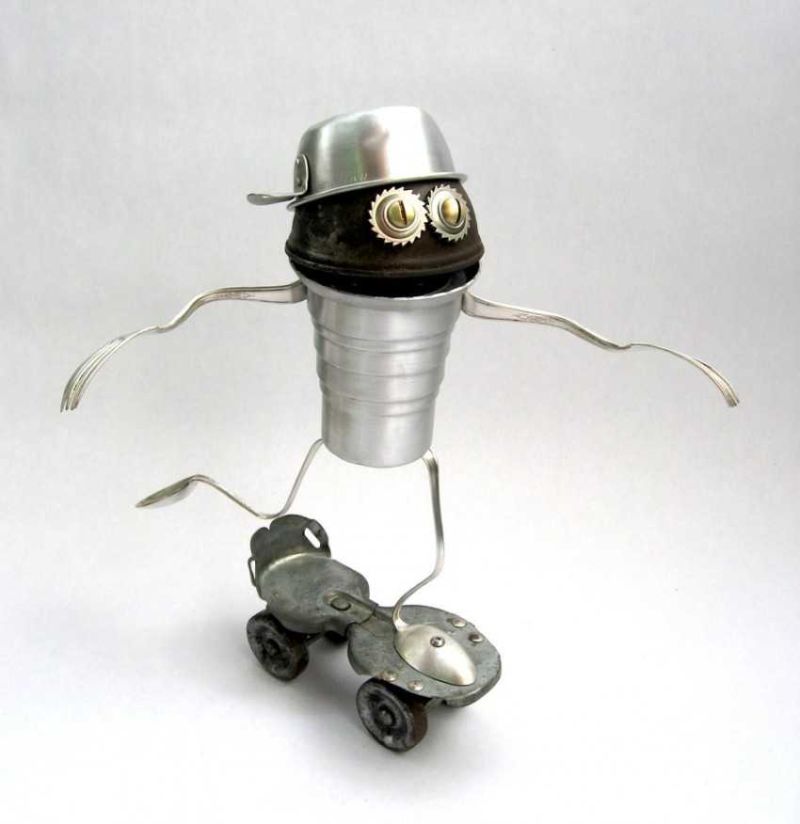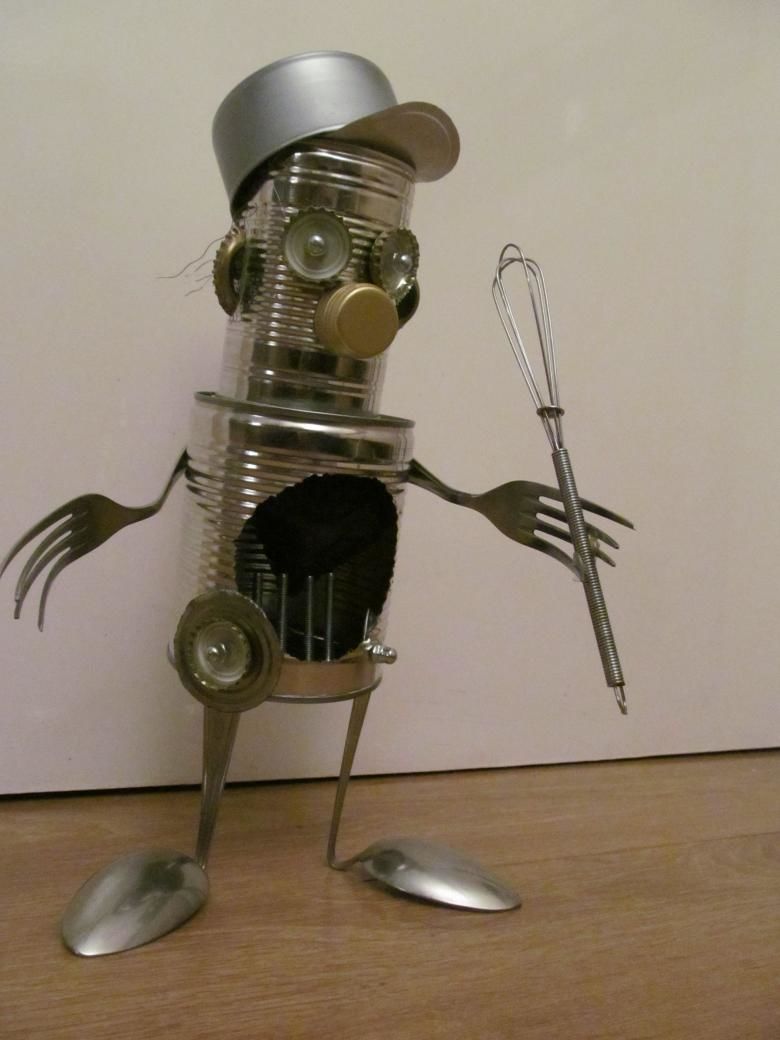 Робот с крака, изработени от стари алуминиеви лъжици, изглежда много оригинално. Лъжиците се огъват лесно и не е много трудно да се направят дупки в тях. А шлемът на бъдещия андроид може да е стара алуминиева чаша или метална цедка за варене на чай. За торса можете да използвате консервна кутия.