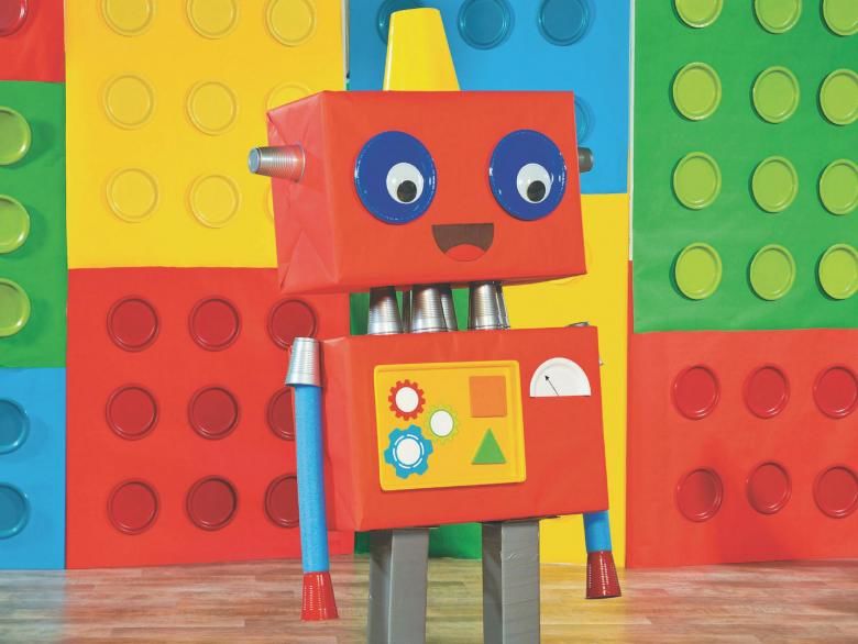 - Сглобявайте отдолу нагоре: залепете краката, раменете и торса. След това залепете главата и ръцете. Нарисувайте контролен панел върху торса, напишете думата "Здравей" или дайте на робота флаг.