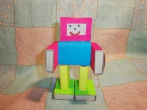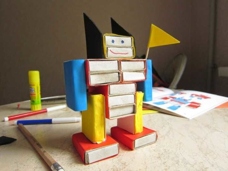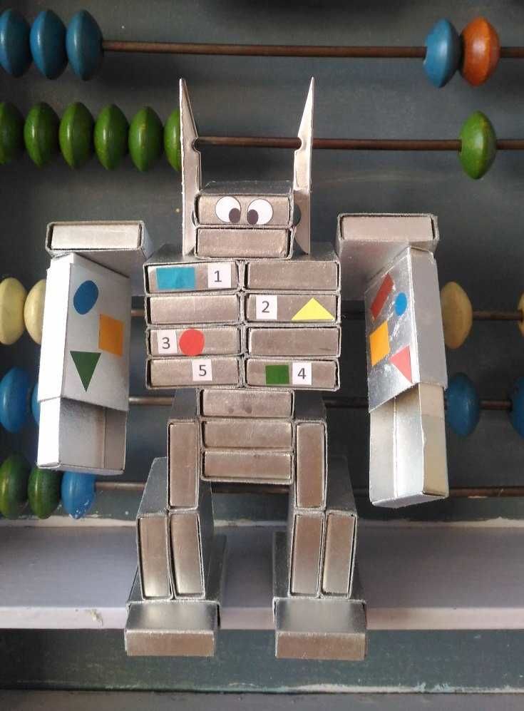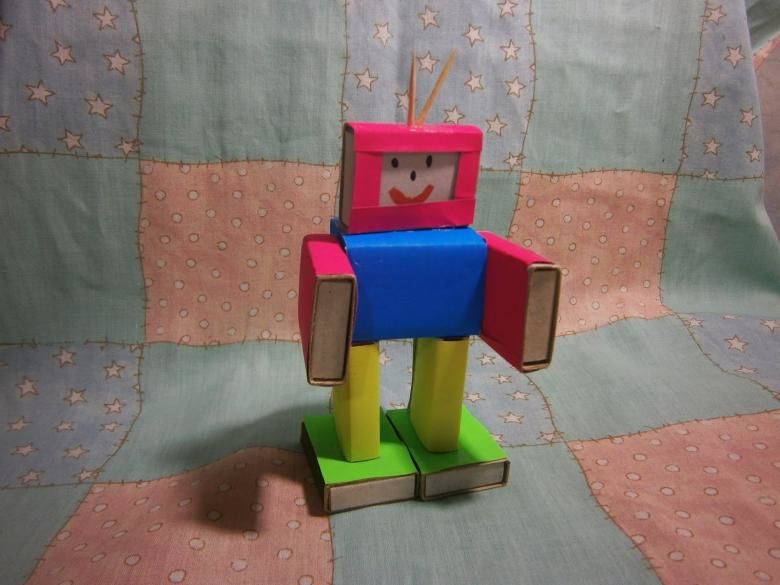 За забавното човече-робот ви трябват поне 15 празни кутии от мачове, лепило, ножица, цветна хартия и флумастери.