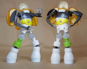 Благодарение на еластичността на гумената лента можете лесно да променяте положението на ръцете и краката. Остава само да прикрепите оръжие, изработено от капачка за биро. За целта направете дупки в ръката или на рамото.