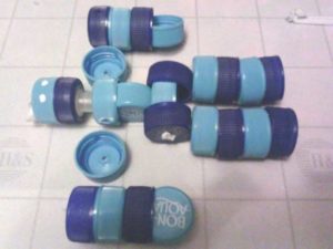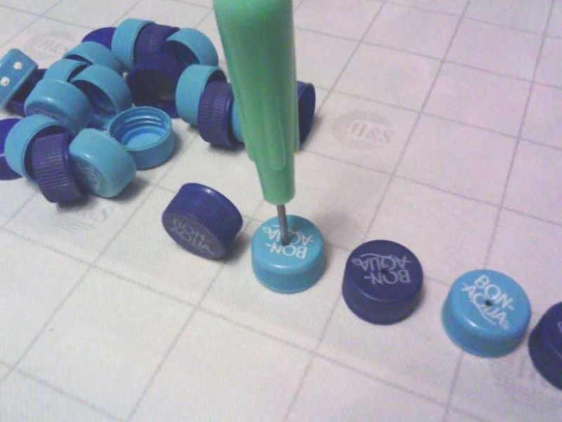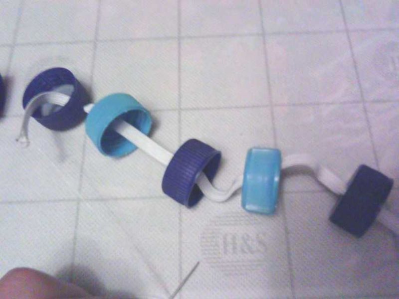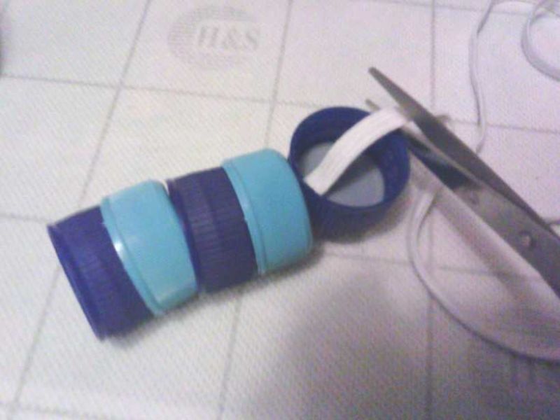 Всички връзки се осъществяват през отвори, направени в капачките с шило. За да прокарате ластик през малките дупчици, зашийте единия край на ластика с конец: той ще бъде издърпан през дупчиците след иглата. Завържете другия край на ластика на възел: