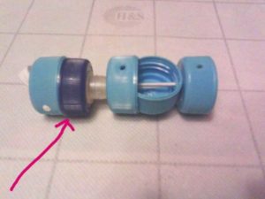 - За закрепване издърпайте единия край на гумената лента през отвора на капачката на бутилката, а другия край - през капака на кутията за кафе, затегнете, завържете възли във всяка капачка.