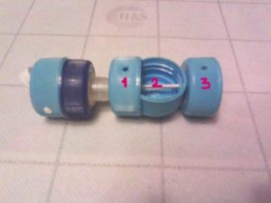 - Туловището е по-добре да е направено от капаци с различен цвят. Направете отвори в центъра на първия и третия капак и два в страничните стени на втория капак, така че да са обърнати един към друг. Сглобявайте върху ластика, като започнете от първия, без да режете ластика.