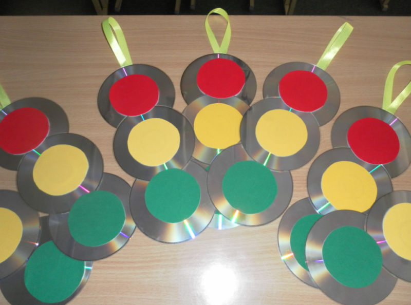 Има много възможности за дисковете и най-важното е да проявите въображение. Ако направите помпони от прежда, залепете ги на диск вместо нос в средата, а очите и устата залепете от хартия. Това са разноцветни клоуни, всеки от които има различно изражение на лицето, съответстващо на цвета на светофара.