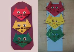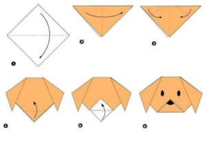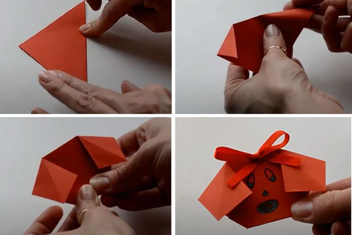 - Направете лица на животни от квадратно парче цветна хартия. За целта сгънете листа в средата два пъти, за да се получи триъгълник. Край на завоя за образуване на уши.