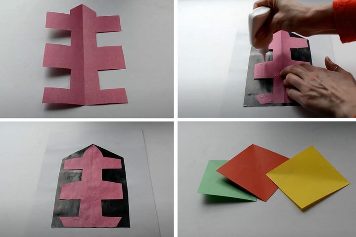 - Покрийте го с черна хартия. Залепете три цветни кръга върху него.