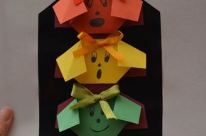 - Долната заготовка се огъва в средата, за да се образува дуло. Залепете очите от бяла хартия и нарисувайте зениците. С маркер нарисувайте устата и носа, мустаците и веждите. Но на животните трябва да се нарисуват различни изражения на лицето. Ако червеното куче или котка са червени, те трябва да са ядосани. Жълто животно има неутрално изражение на лицето. А зеленият е весел.