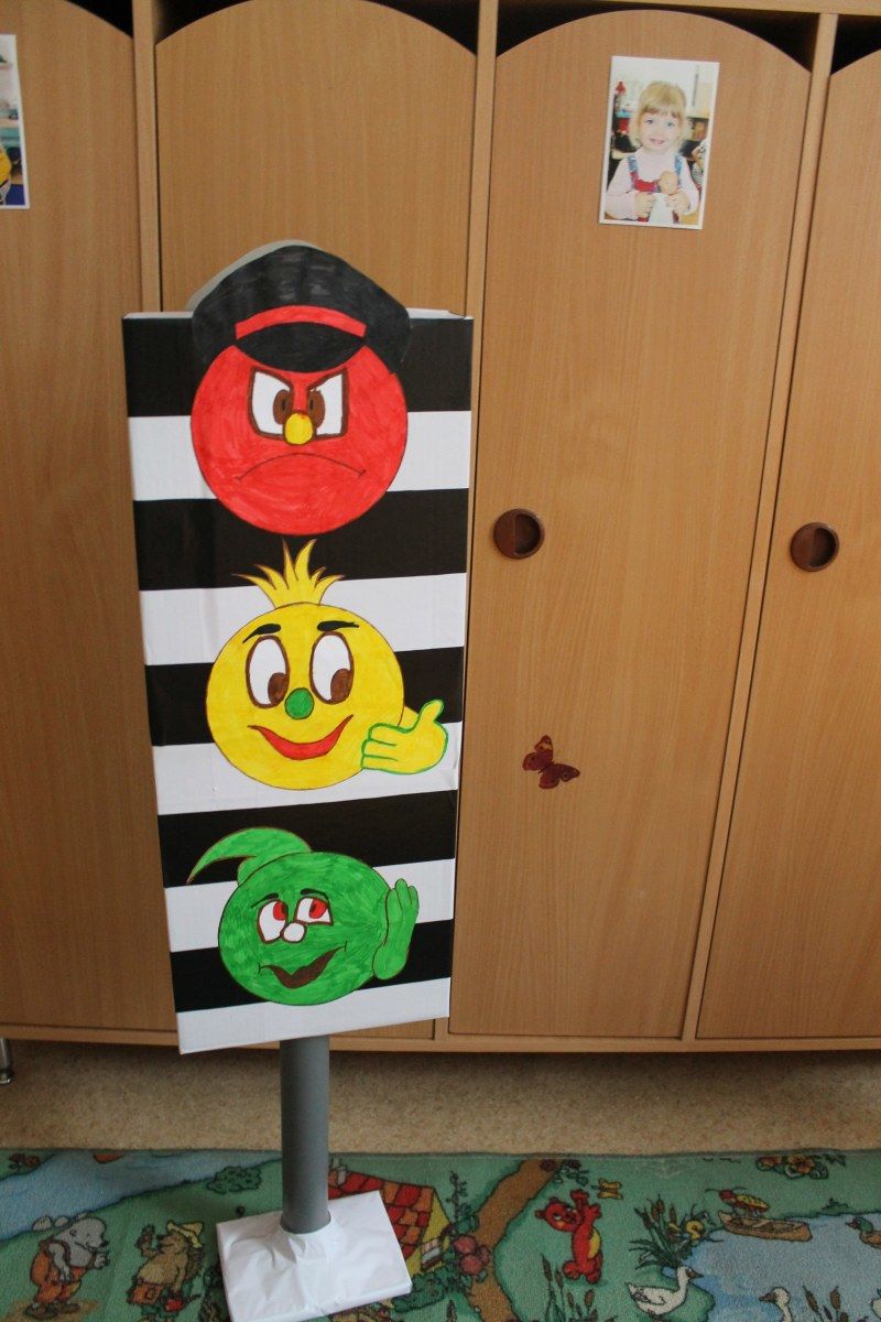 - Върху всеки цветен диск може да се нарисува смешно лице. Например, на червен диск ще бъде тъжно, защото движението е забранено. Върху жълт диск лицето прави сериозна физиономия, която показва, че сте готови да пресечете пътя. Зеленият диск е с усмихнато лице, защото можете да се движите.