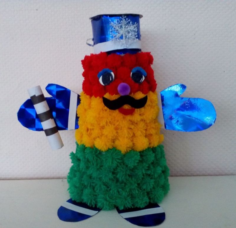 - Украсете с шапка, изрязана от картон, и залепете ръцете. Поставете палка в едната си ръка.