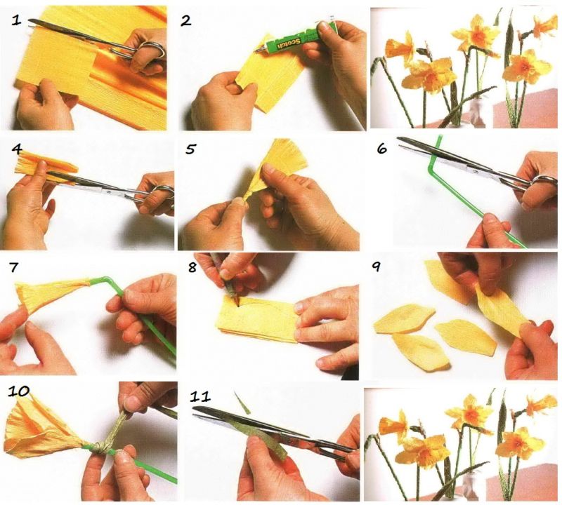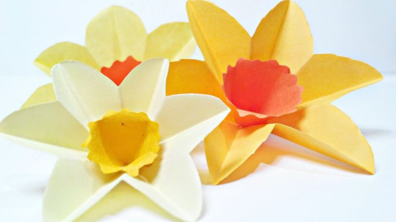 Ярък и запомнящ се пример за хартиени цветя е нарцисът. Изработването му е по силите дори на учениците от прогимназията. Необходими материали: