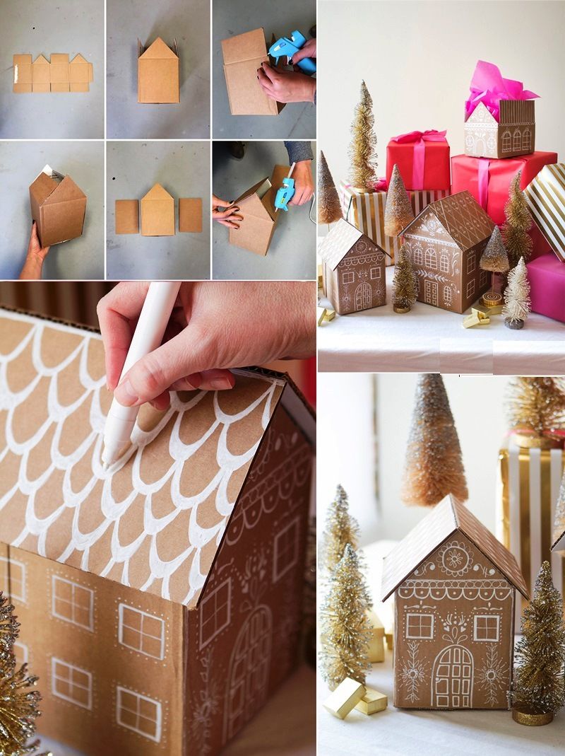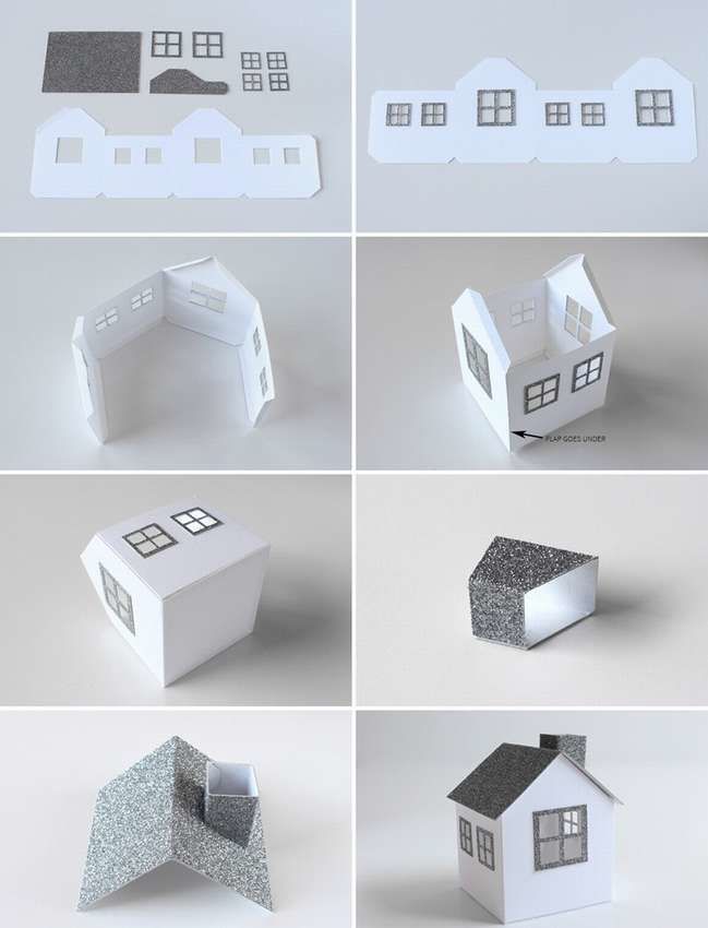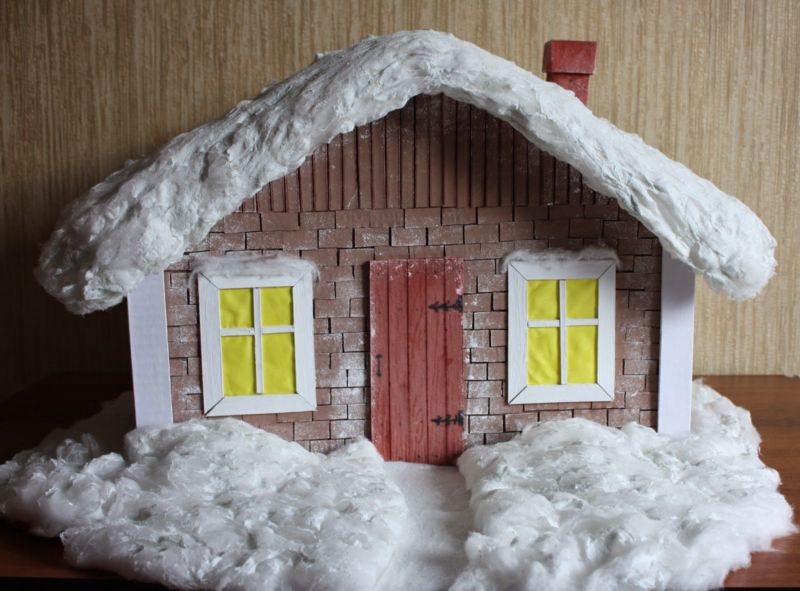 Интересно решение е опаковането на подаръци под формата на къщичка. Препоръчва се да отпечатате от интернет чертежи и схеми на картонени къщи.