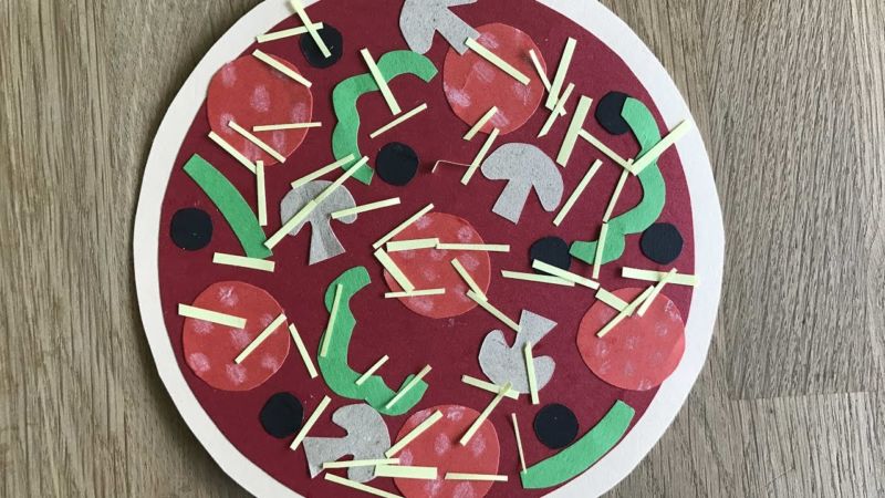 Можете да работите с отпечатани шаблони, тогава пицата изглежда по-реалистично; децата трябва да поставят готовите форми върху чинии, да ги залепят добре и да ги представят на публиката.