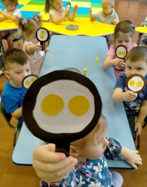 Направете белтъците от бяла хартия, като ги откъснете, поставете ги в паничка около жълтъците и ги залепете. Младите готвачи усъвършенстват уменията си. Занаятите "правене на яйца с глазура" могат да се включат в ролеви игри.