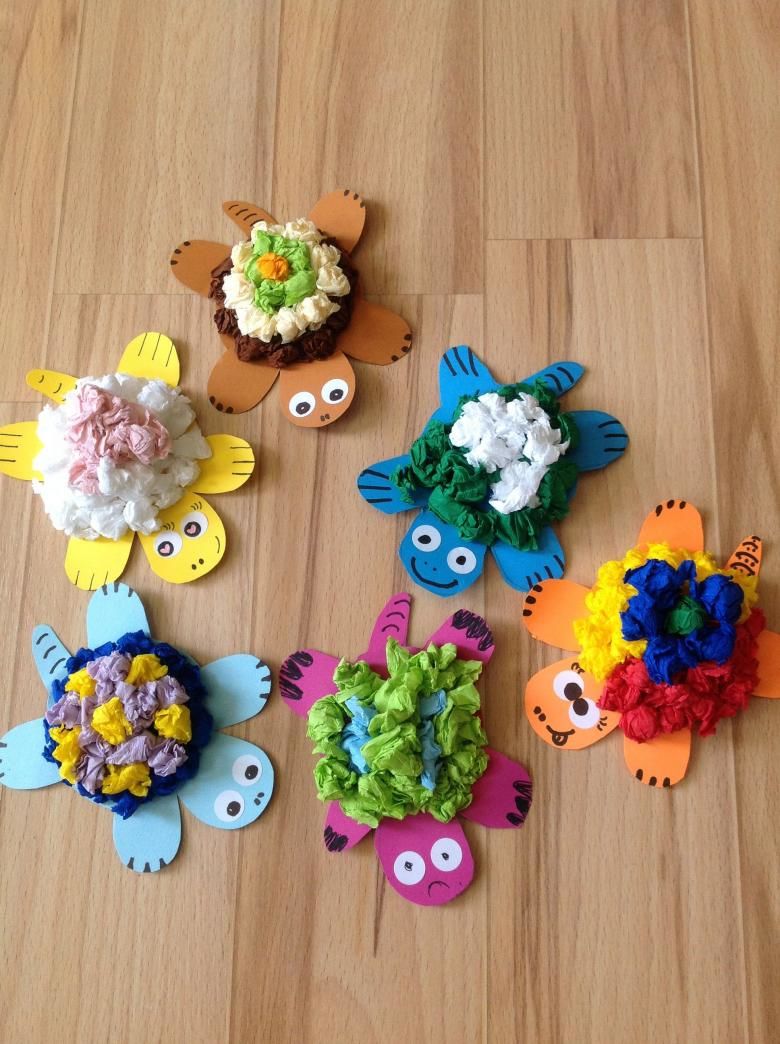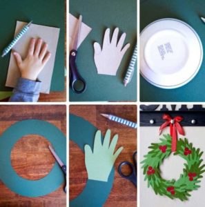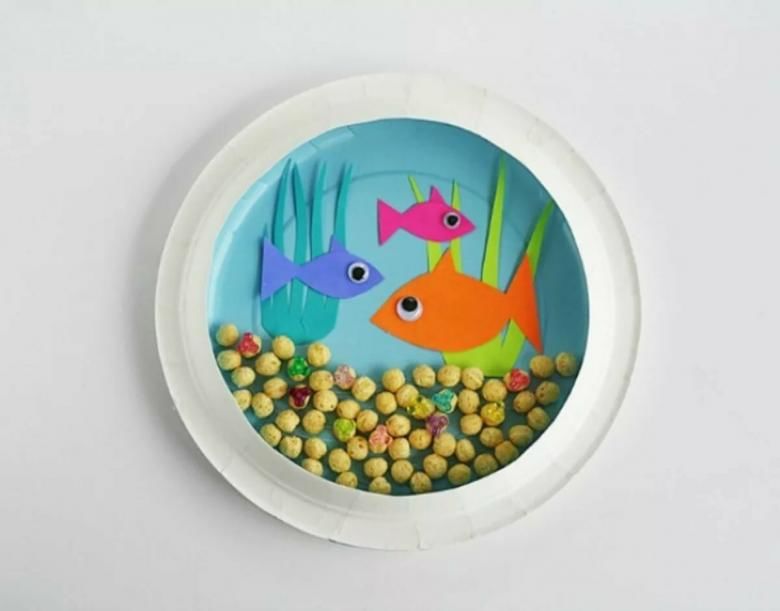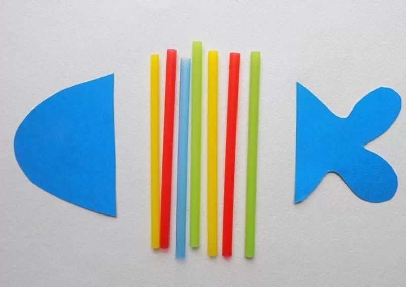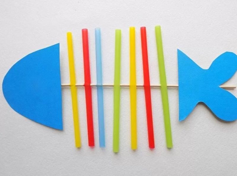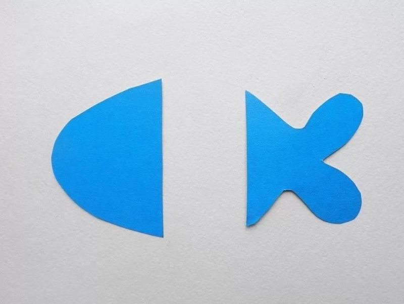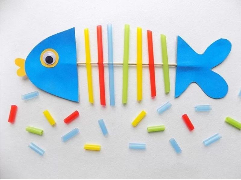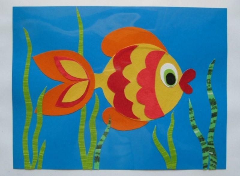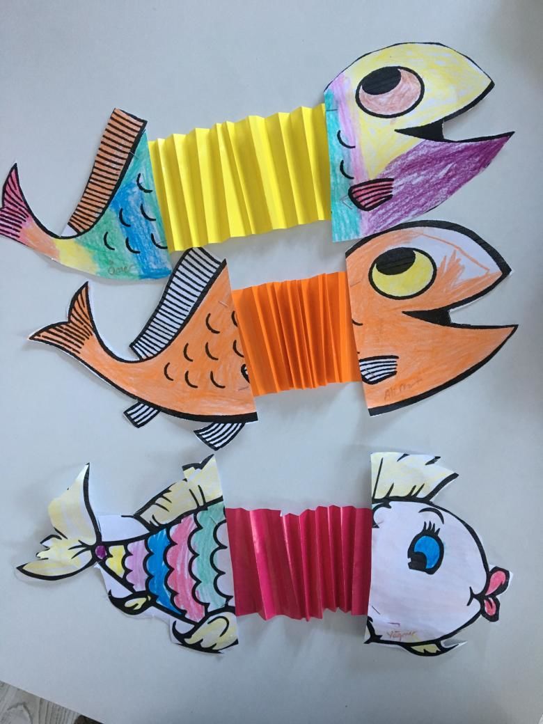 Децата очертават дланите си, изрязват ги и ги рисуват. Пръстите на дланта са опашката на рибата, а дланта е тялото и главата на рибата: