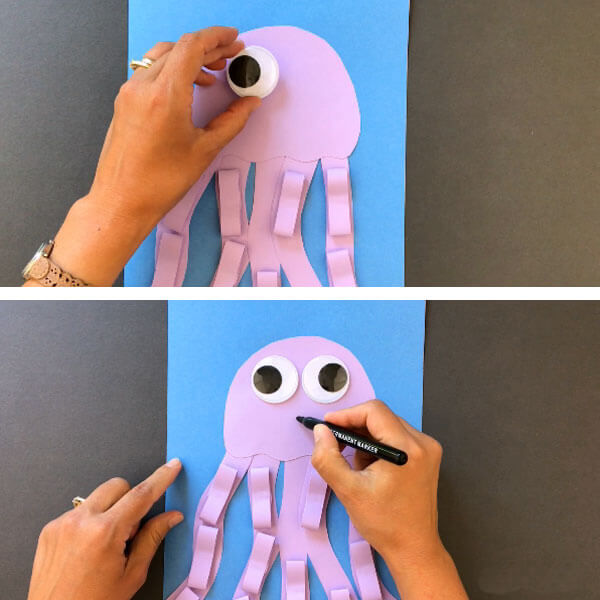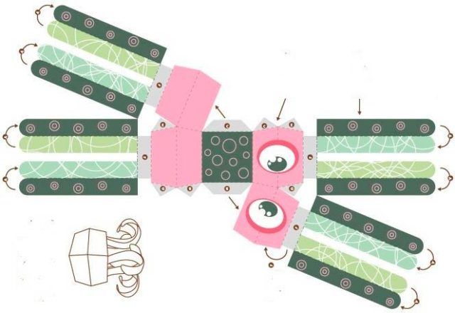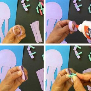 - Навийте лентите на хармоника. Залепете 4 ленти към предната част от вътрешната страна, а останалите 4 ленти залепете към задната част. Получавате страхотен октопод с дълги пипала.