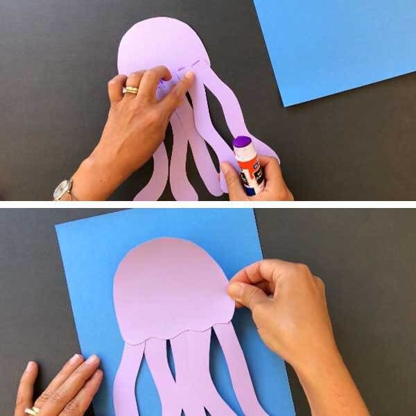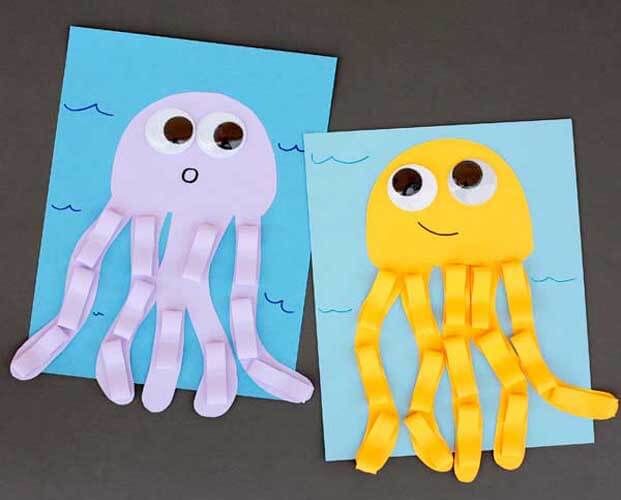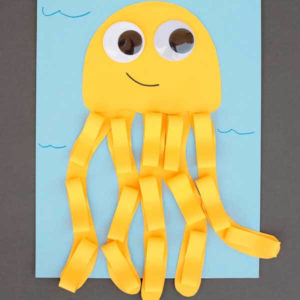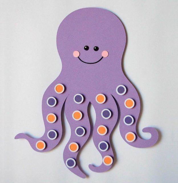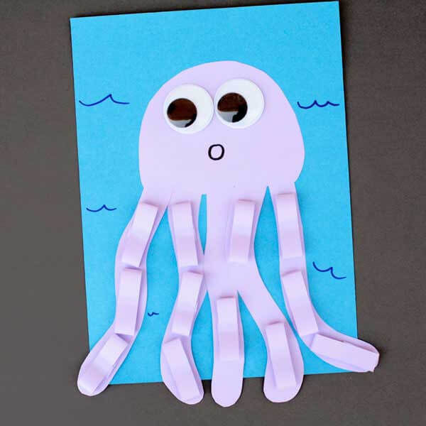 - Нашето морско същество няма пипала. Правим ги от друг лист цветна хартия. Разделете го на 8 вертикални ленти с дължина 2 см всяка.