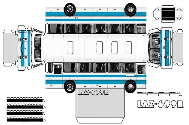 Нарисувайте контур на автомобил върху тънък картон, сгънат наполовина, използвайте шаблон. Изрежете, залепете или нарисувайте прозорци, колела. Покривът на автобуса е в сгъваемата част на картона. Отворете шаблона и поставете изделието вертикално. Автобусът ни се движи по маршрута.