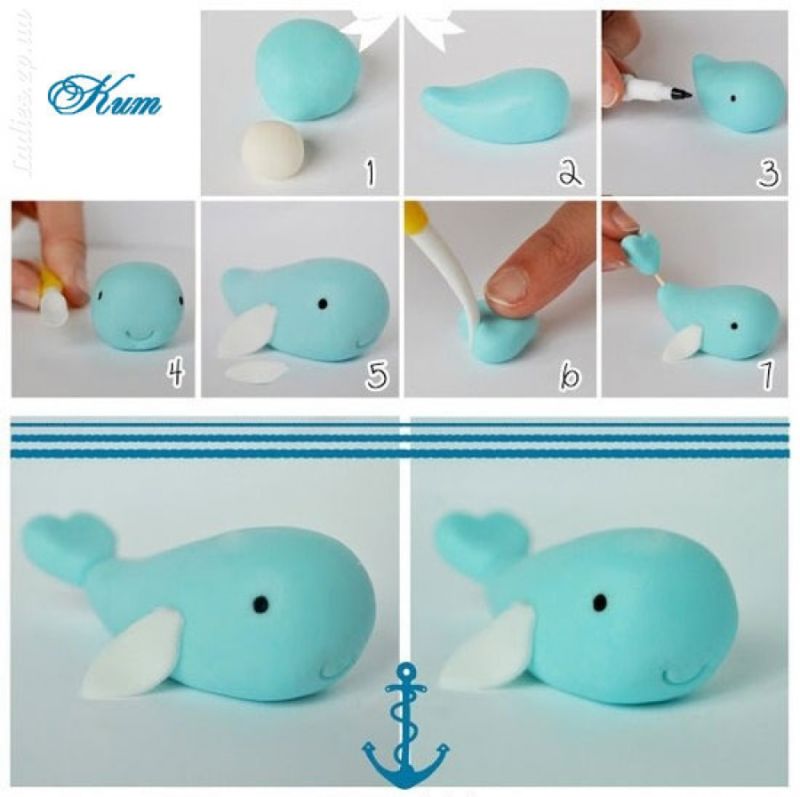 - Отделете парче синьо или син пластилин, разточете топче, след което издърпайте малко от цялото парче - опашката. Вземете бялата глина и я сплескайте в ръцете си.