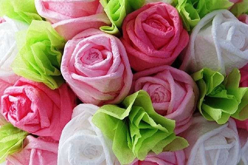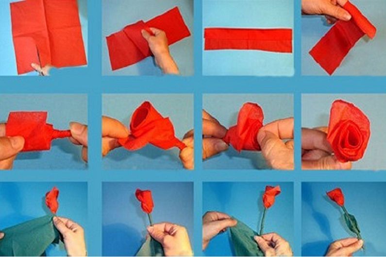 Нарежете салфетката на квадрати по линиите на прегъване. Розите се предлагат в различни цветове, но най-вече в розово, червено, жълто и бяло. По същия начин изберете цвета на салфетките: