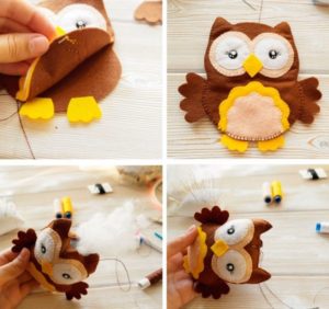 - Сега изрежете човката, очите от филцовия плат, можете да използвате готови елементи или да ги замените с копчета.
