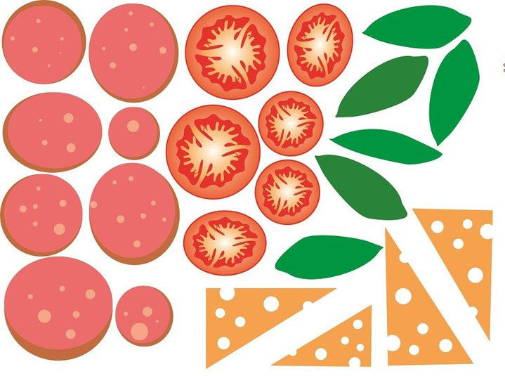 - Кръгове от розова хартия - колбас, половинки от червени кръгове - домати, резени зелена краставица, лук, маслини, жълти ленти - сирене.