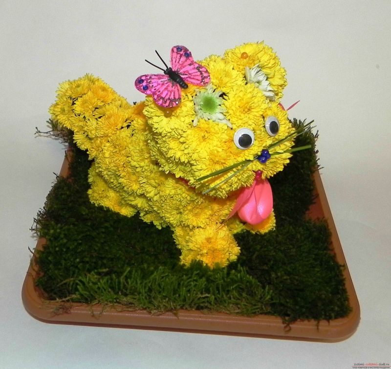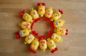 За пиленцето можете да направите тревна площ от зелени картонени кръгчета. Пиленцето е поставено на тревата, а цветята от пластилин допълват композицията. Няколко пилета могат да се поставят в плетена кошница.