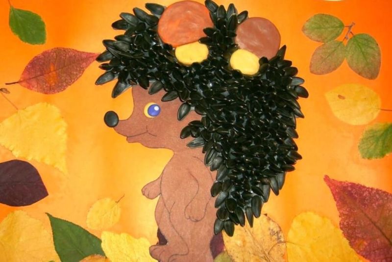 За апликацията на таралеж са ви необходими дебел цветен картон, кафяв пластилин, семена, истински листа и цветна хартия. Инструкции стъпка по стъпка: