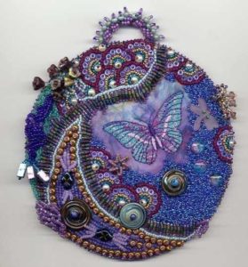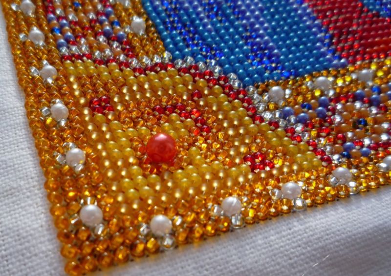 Първо изберете всички области в един и същи цвят, покрийте ги със слой лепило и поръсете с мъниста. Излишъкът се изтръсква. Повторете същото с всички цветни зони.