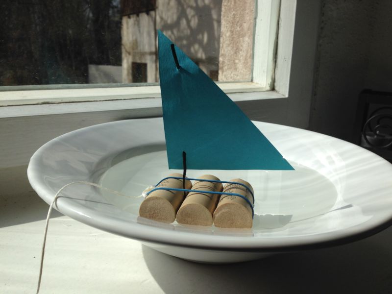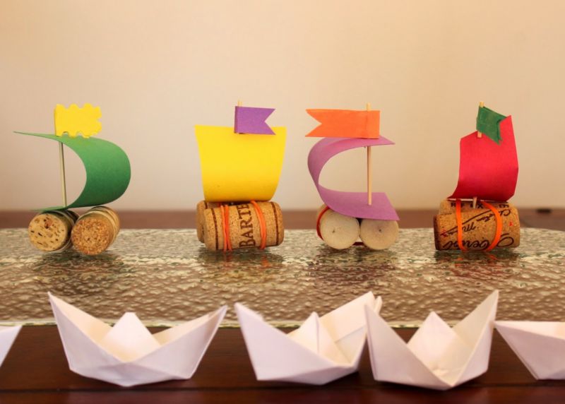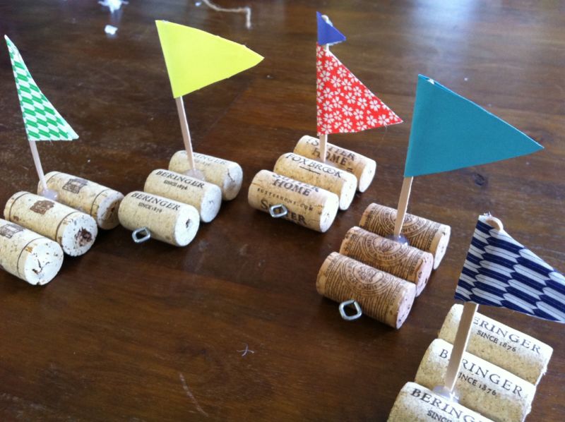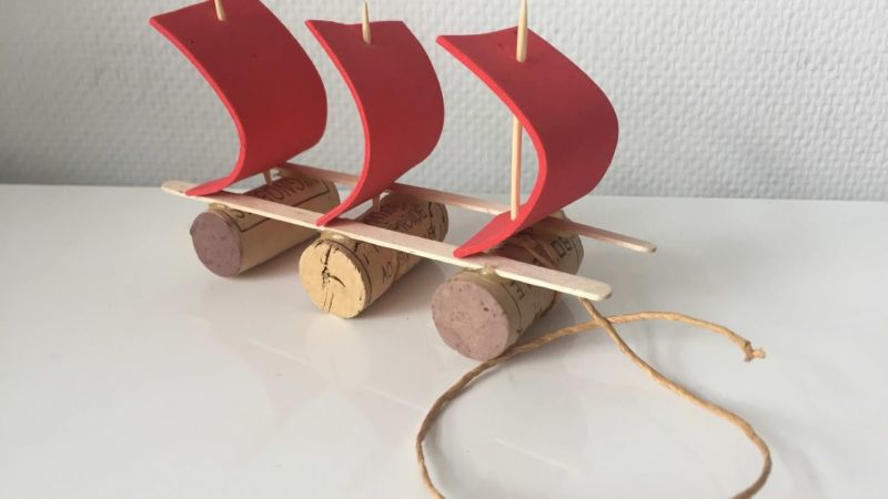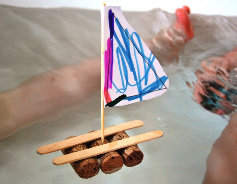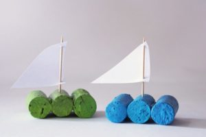 - Вземете три коркови тапи и ги залепете една за друга, за да образуват малък сал.