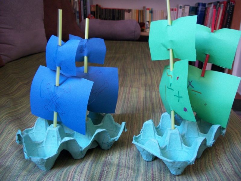 Какво ви е необходимо: Картон за яйца, японски пръчици, цветна хартия, картон, стикери с пиратска тематика, гваш, лепило, ножица, четки.