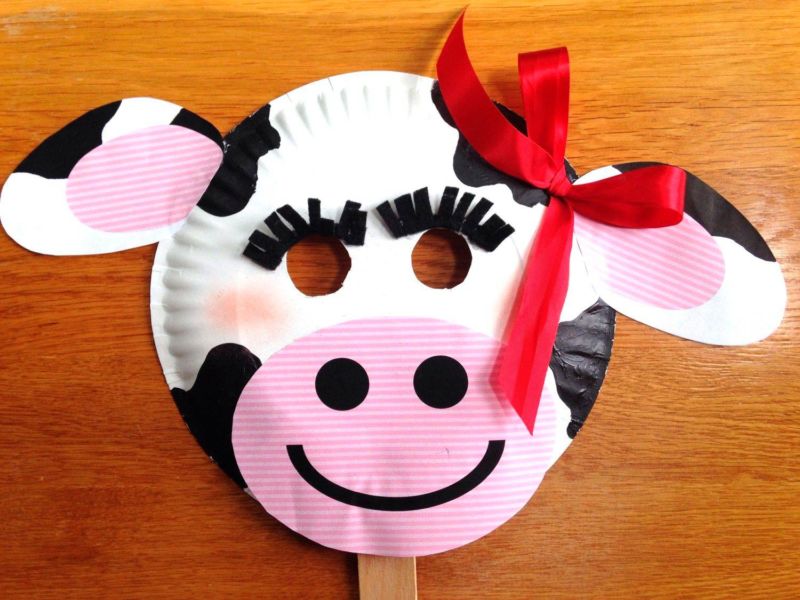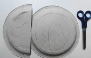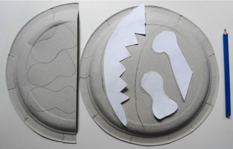 - Върху чиния направете прорези за очите, отбележете местата за закрепване на гумените ленти.