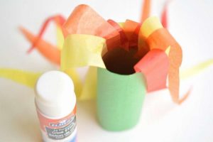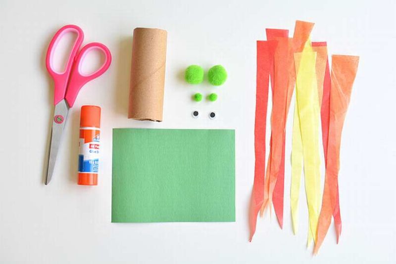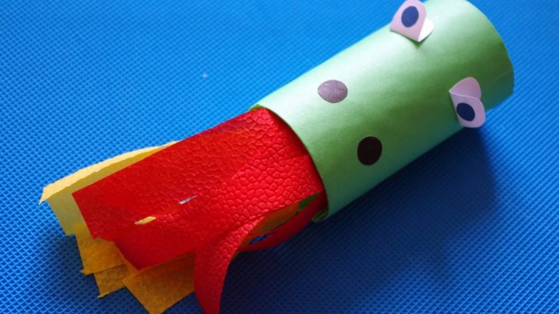 - Изрежете ленти и спирали от велпапе (за предпочитане в топли цветове) и ги залепете към свободния край на ръкава. Те ще имитират пламък, излизащ от устата на хвърчилото.