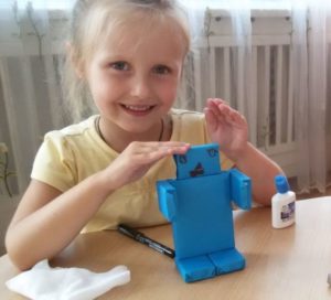 - Свържете кубчетата с връвчицата и сглобете човечето.