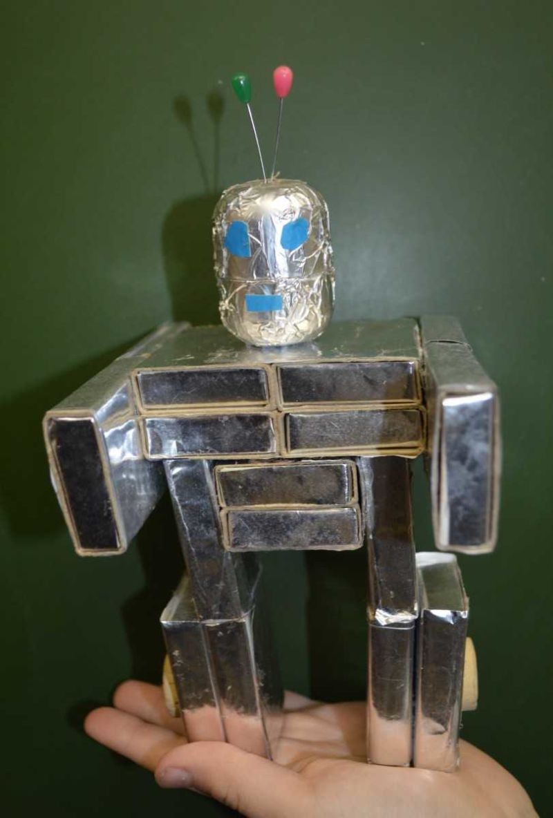Какво ви е необходимо: Празна кутия, 11 кутийки за мачове, сребърно фолио, очички за играчки, 2 пружини за писалка, ножица, лепило.