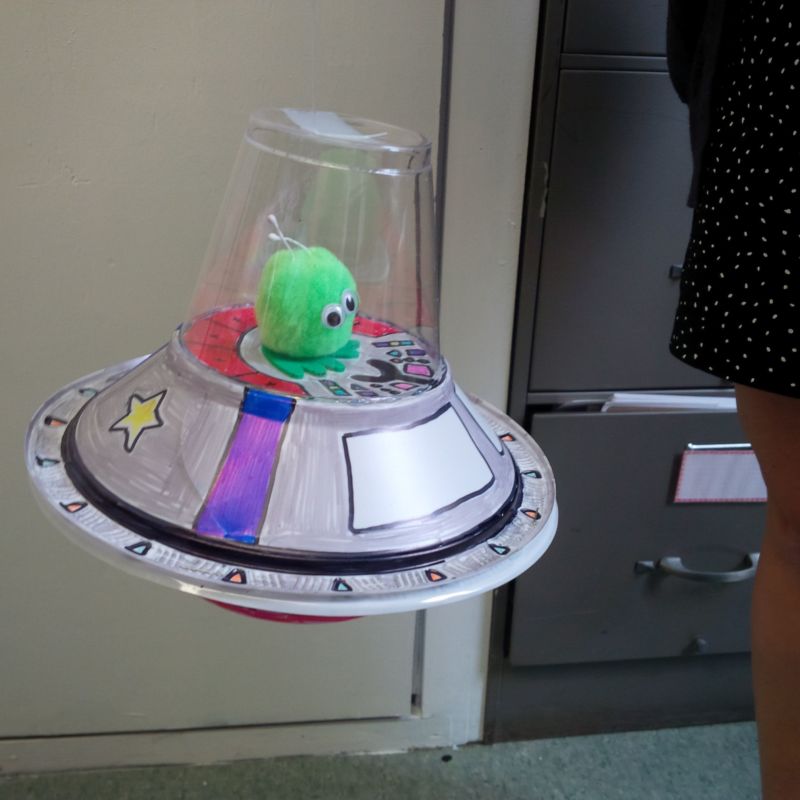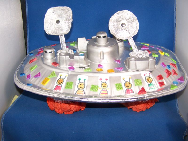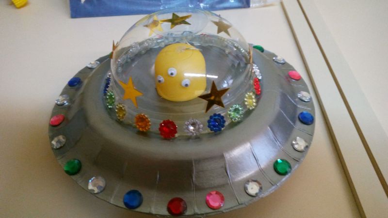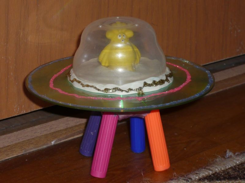 Неидентифицираният летящ обект е готов! Ако искате да украсите стаята на детето си, сглобете няколко такива предмета от цветни съдове, свържете ги с гирлянди или мобайли и ги окачете на стените. Полученият ефект е ярък и весел.