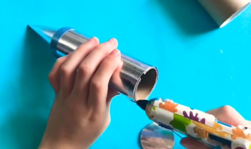- Закрепете цилиндъра с телбод, залепете дъното с картонени кръгчета и нарисувайте устата и изпускателната тръба.