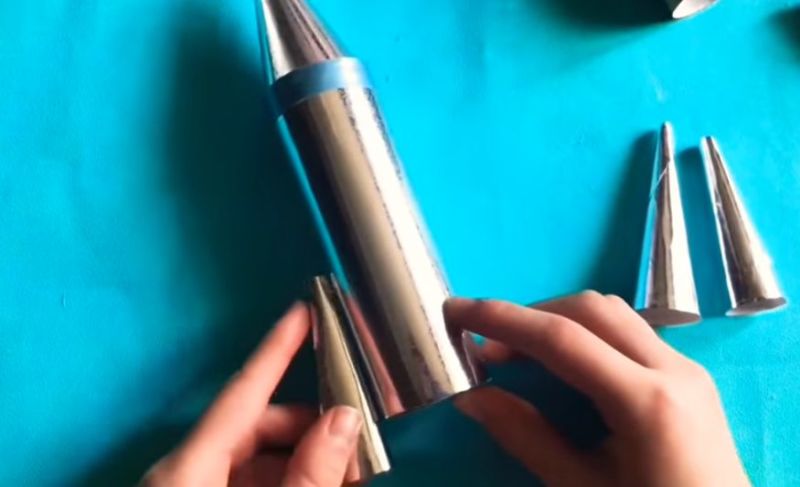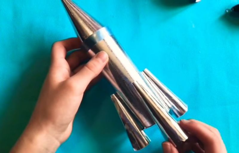 - След това направете продълговат цилиндър и конуси от тези форми, за да имитирате заострения нос и лопатките на ракетата.