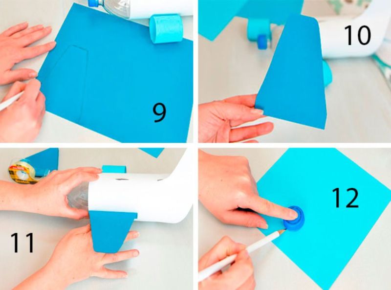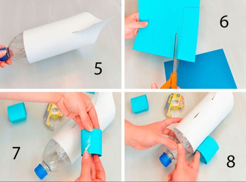- Прикрепете конуса и четвъртините на кръга към бутилката, за да направите остър чучур и лопатки на ракетата.