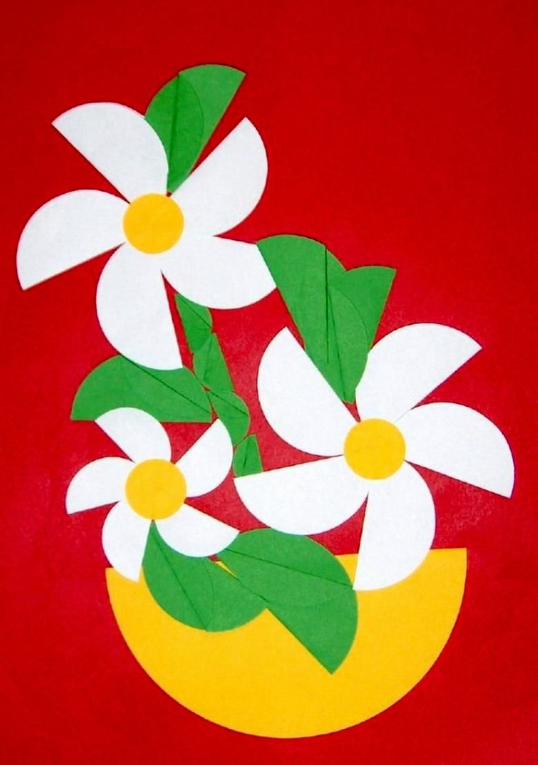 - Подредете и залепете върху картона в следния ред: първо стъблото и листата, а след това самото цвете.
