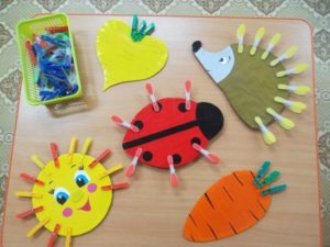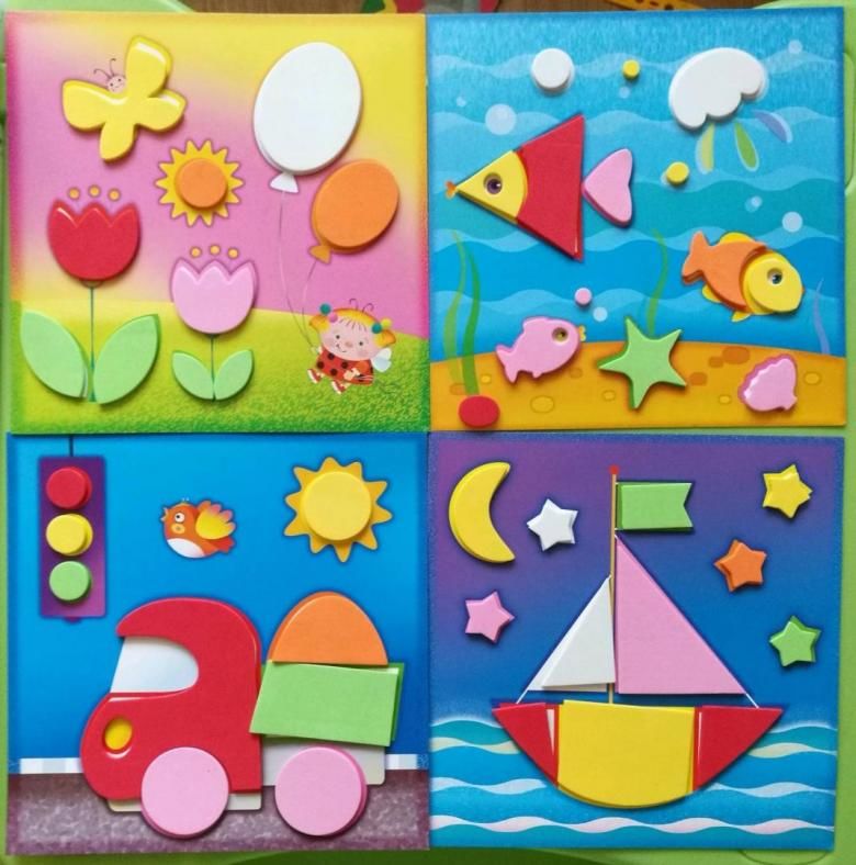 Приложенията трябва да са прости, ярки и интересни. Те могат да бъдат геометрични фигури, силуети на животни, плодове, зеленчуци и др.
