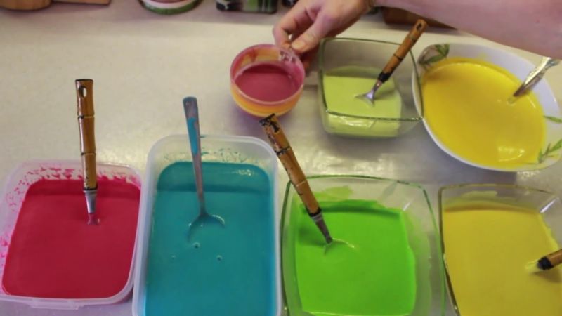 Разбъркайте съставките с миксер, за да раздробите всички бучки. Добавете маслото към сместа, след като е разбъркана. Разпределете ги в стъклени бурканчета за бебешка храна и добавете оцветител във всяко бурканче.