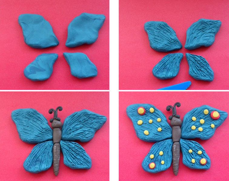 - Направете 4 крила, две големи и две по-малки, от пластилина, избран от детето ви.