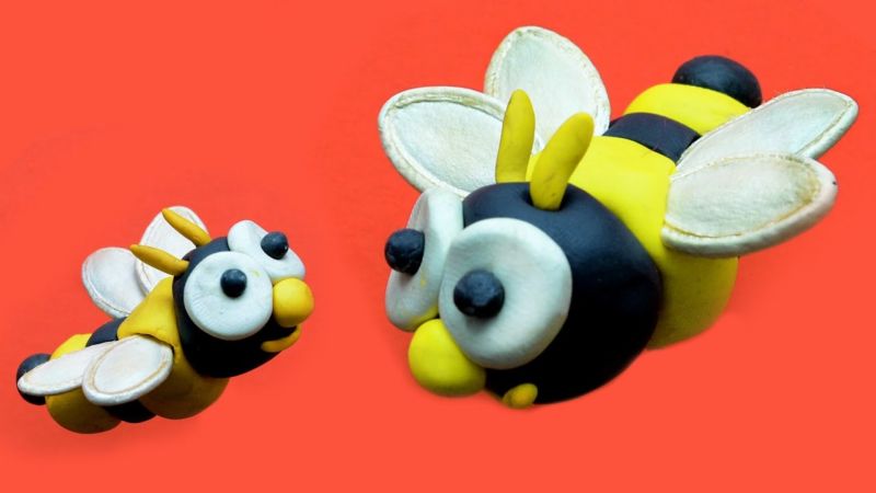 Направете лентички от тънки черни пръчици и залепете тялото в кръг. Изстискайте две бучки бял пластилин и ги залепете на мястото на крилата. Оправете очите и пчелата е готова!