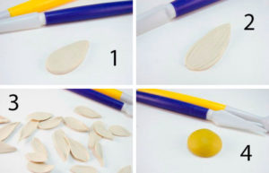 - Разточете топчета от бял пластилин за венчелистчетата, сплескайте ги и ги оформете в леко капковидна форма, като ги притиснете от едната страна.