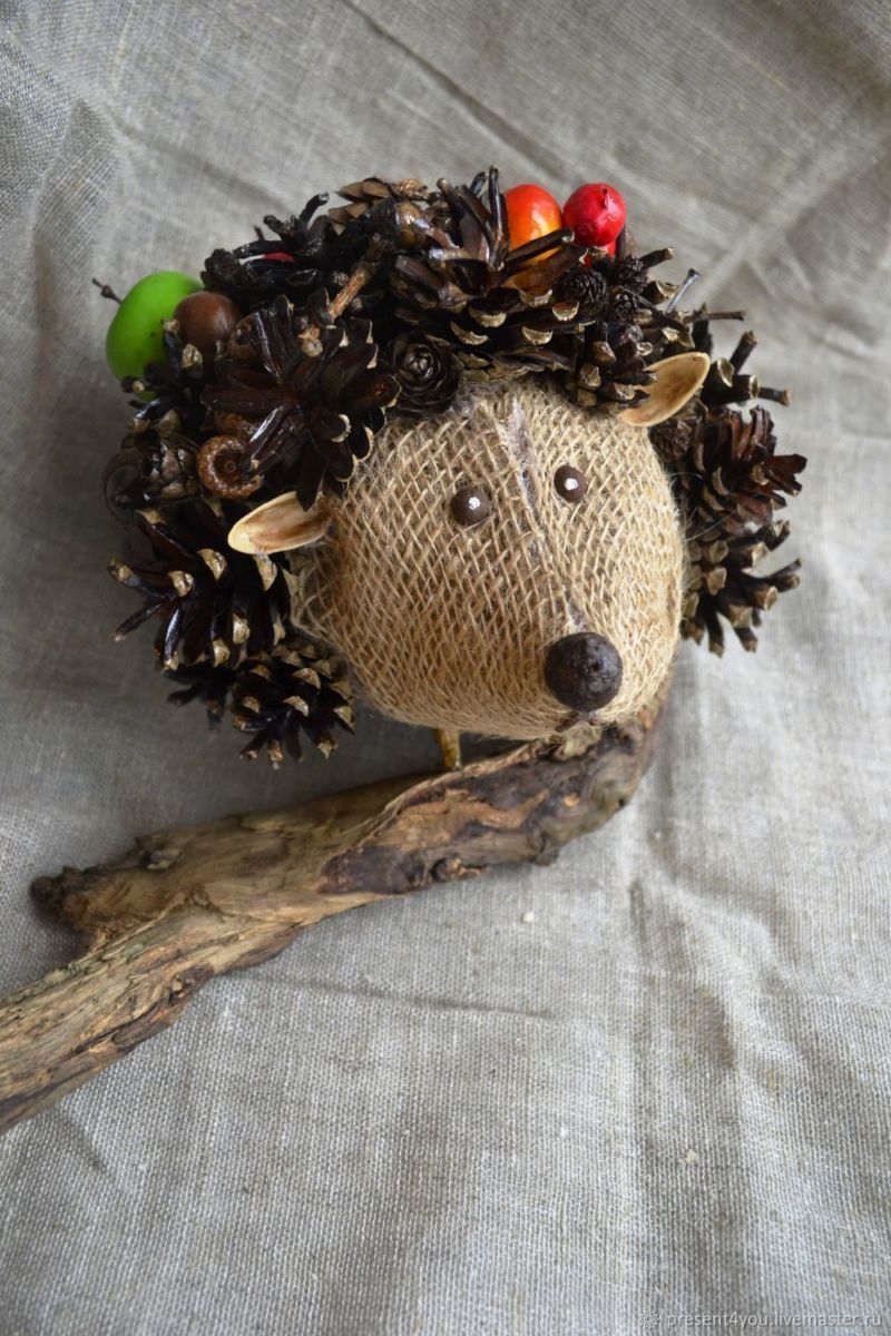 За таралежа конусът е по-добър от всеки друг естествен материал. Самата природа е създала за него готови тръни. Трябва само да направите муцуна от пластилин на опашката на конуса, да прикрепите чучур и очи. Отделно направете ябълки и гъби и ги прикрепете към шиповете.