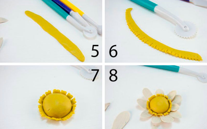 - За центъра на цветето разточете малки жълти топчета и ги залепете.