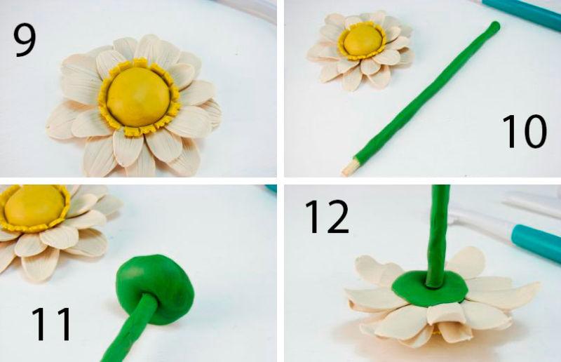 Помогнете на бебето си да извая маргаритка като подарък за баба. Необходими са ви бяла, жълта и зелена глина и мач за стеблото: