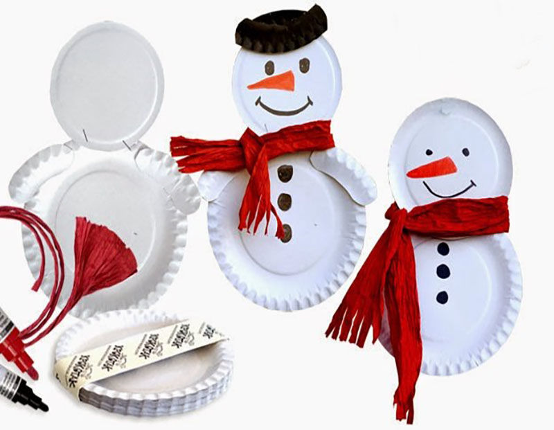 Снежният човек е особено популярен занаят за децата в новогодишната нощ. Необходими са ви две чинии, ножица, лепило и цветна хартия: