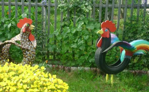 Кокошка и петел, изработени от гуми